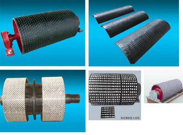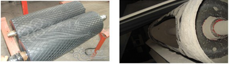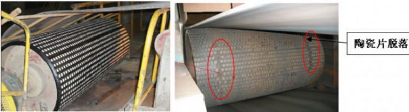 二、采用粘貼或硫化陶瓷片的方法來增加滾筒的耐磨性能(皮帶張力與滾筒表面摩擦力會形成一個強大的剝離力,該剝離力很容易將陶瓷片從橡膠上撕下來,實際使用壽命不長,也需要反復包膠)